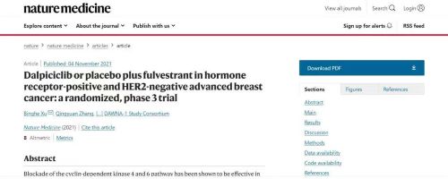 近日,24h直播医药自主研发创新药达尔西利(Dalpiciclib,CDK4/6抑制剂)联合氟维司群治疗激素受体阳性HER2阴性晚期乳腺癌的3期临床研究(DAWNA-1)在国际顶级权威杂志《自然医学》(Nature Medicine,2021年影响因子:53.44)全文在线发表。这是继三种CDK4/6抑制剂的PALOMA、MONARCH、MONALEESA系列乳腺癌领域3期研究陆续发表于NEJM、Lancet Oncology、JCO等期刊后,又一新型分子结构的CDK4/6抑制剂(也是国内原研的首个CDK4/6抑制剂)的3期临床研究数据,再次登上顶尖医学期刊。