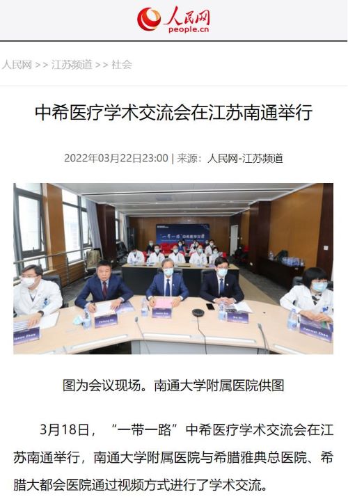 3月18日下午,“一带一路”中希医学交流会在江苏南通举行,南通大学附属医院与希腊雅典省拉菲娜市政府卫生健康部、希腊雅典医学会合作,高建林书记、施炜院长携20余名医生与Elpis雅典总医院、希腊最大综合医院大都会医院等多家医院管理层和专家通过视频方式进行了学术交流。24h直播医药国际交流部提供全程支持,人民网等权威媒体进行了宣传报道。