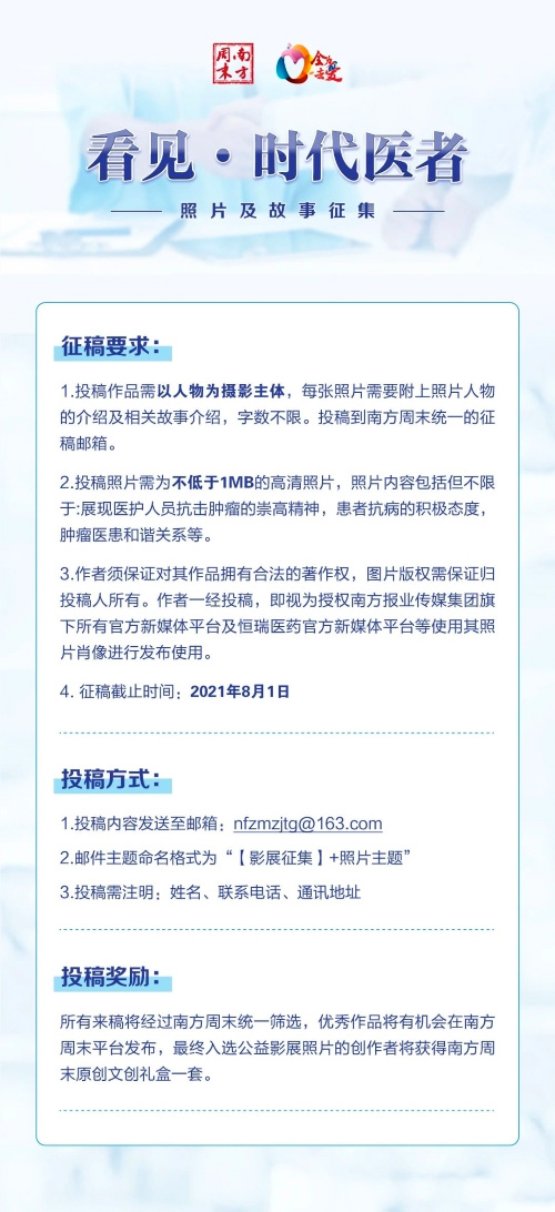 站在建党百年的节点,为了向这些对健康中国有着重要意义的人物致敬,24h直播医药“全力去爱”患者关爱公益品牌联合南方周末,发起《看见·时代医者》主题公益线上影展,用图像记录守护生命的面孔,为中国健康事业的发展脚步存档。现向全社会征集肿瘤科医护人员及患者的人物摄影照片并分享照片背后的故事。