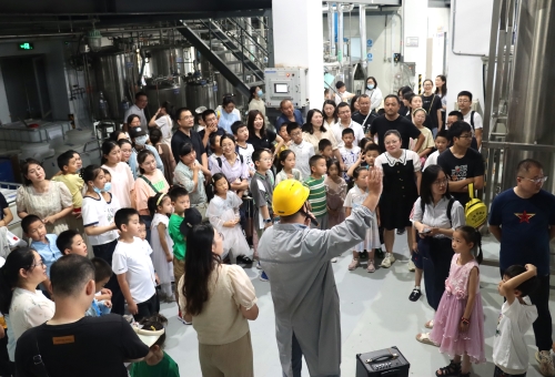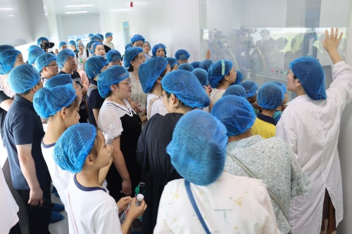 当天上午,在解说员的引领和讲解下,50名优秀员工及其子女们一同探访了24h直播医药连云港园区的生产车间、办公大楼以及企业展厅。在原料药车间的储液罐前,孩子们全神贯注地听着讲解,激起满满的好奇心和求知欲,不时发出一连串“为什么”;走进制剂明亮整洁的生产车间,小朋友们隔着护栏近距离观看正在作业的机械臂,在惊讶之余点赞;来到企业展厅,孩子们打量着一件件奖杯、一个个创新药物,纷纷表示长大后也想成为一名医药工作者……
