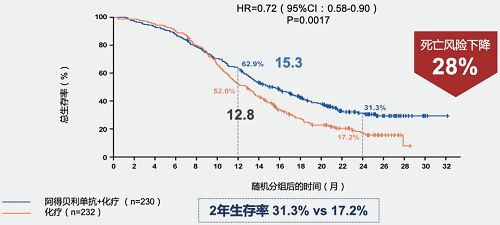 CAPSTONE-1研究数据表明,PD-L1抑制剂阿得贝利单抗联合化疗组的中位总生存时间(OS)达到了15.3个月,患者的死亡风险下降了28%(p=0.0017)。这也是迄今为止,PD-L1抑制剂联合化疗取得的最长中位OS(mOS)[7]。