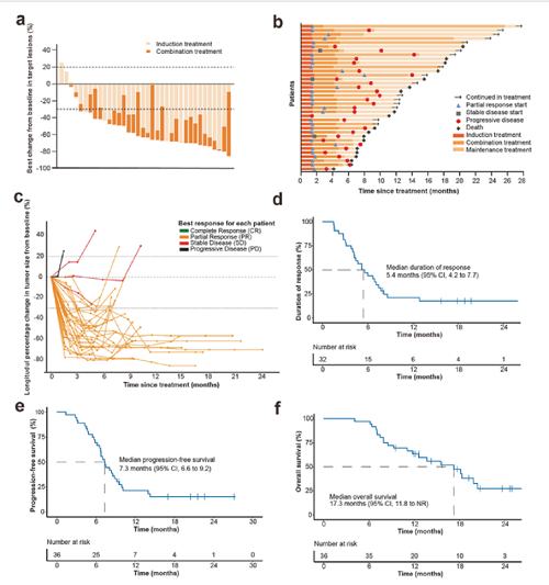 在36例可评估的患者中,总体ORR为88.9%(95% CI:73.9%-96.9%),其中32例(88.9%)患者部分缓解(PR),3例(8.3%)患者病情稳定(SD)(表2)。DCR为97.2%(95% CI:85.5%-100%)。中位PFS为7.3个月(95% CI:6.6-9.2)。中位OS为17.3个月(95% CI:11.8-未达到)。12个月OS率为63.4%(95% CI:45.4%-76.9%)(图2)。