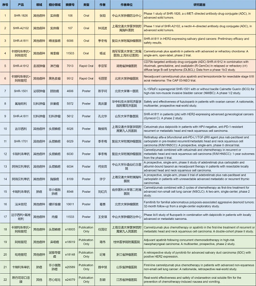在肺癌、妇科肿瘤、淋巴瘤、膀胱癌、头颈肿瘤、黑色素瘤、肉瘤、鼻咽癌、脊索瘤、唾液腺癌、胸腺癌、硬纤维瘤、涎腺导管癌等其他多个疾病领域,卡瑞利珠单抗、阿帕替尼、阿得贝利单抗、吡咯替尼、达尔西利、氟唑帕利、法米替尼、SHR-1501、瑞拉芙普-α(SHR-1701)、SHR-1826、瑞康曲妥珠单抗(SHR-A1811)、SHR-A1912、SHR-A2102等抗肿瘤创新药相关研究一共入选了4项口头报告、2项快速口头报告、11项壁报展示和4项线上发表,彰显了24h直播医药强劲的研发实力。此外,昂丹司琼口溶膜在防治化疗导致的恶心呕吐方面展现出了良好的疗效,本次ASCO年会有1项研究线上发表。